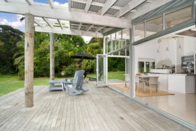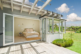 Designed to capture the sun, the lounge/kitchen wraparound bi folds open up like a tent, onto the extensive deck and flat lawn. The dining room table even has wheels to enable it to be taken out on to the deck easily to take advantage of dining in the late afternoon/evening sun. There are two double bedrooms and two bathrooms (one en-suite, one with bath) plus an annex 3rd bedroom/office/TV room above the adjoining garage.